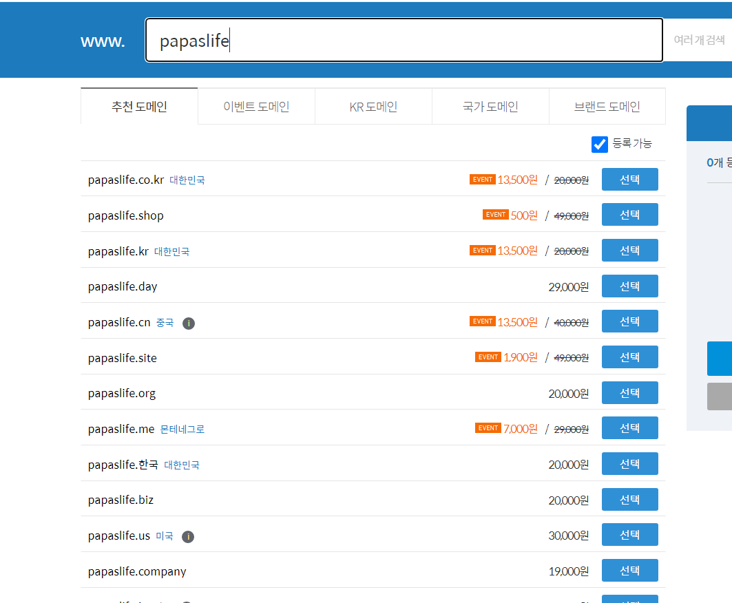 그럼 위와 같이 뜨는데 제일 싼거 선택한다.(이벤트 도메인에 500원 언저리로 나온다)