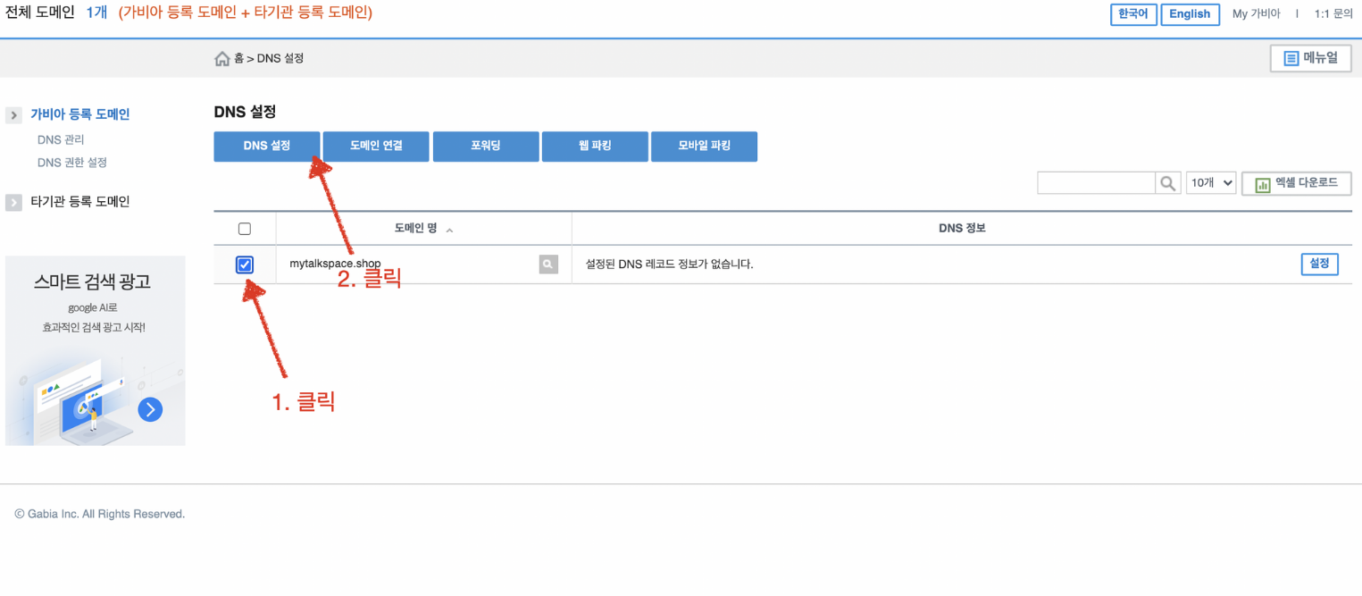 DNS 설정 할 도메인을 누르고 DNS 설정 버튼을 눌러준다.