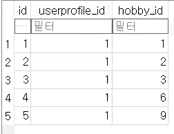 상단과 같이 userprofile과 hobby가 값으로 있는 중간 테이블 구조를 볼 수 있다.
