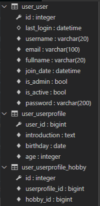 분명 UserProfile에 hobby를 만들었는데 hobby가 없는것을 볼 수 있다. 그 이유는 외래 키에 2개 이상의 id값이 들어갈 수 없어서 DB자체적으로 중간 테이블을 만들기 때문이다. 위에서 userprofile_hobby라는 만들지 않은 테이블이 생성된것을 볼 수 있다.